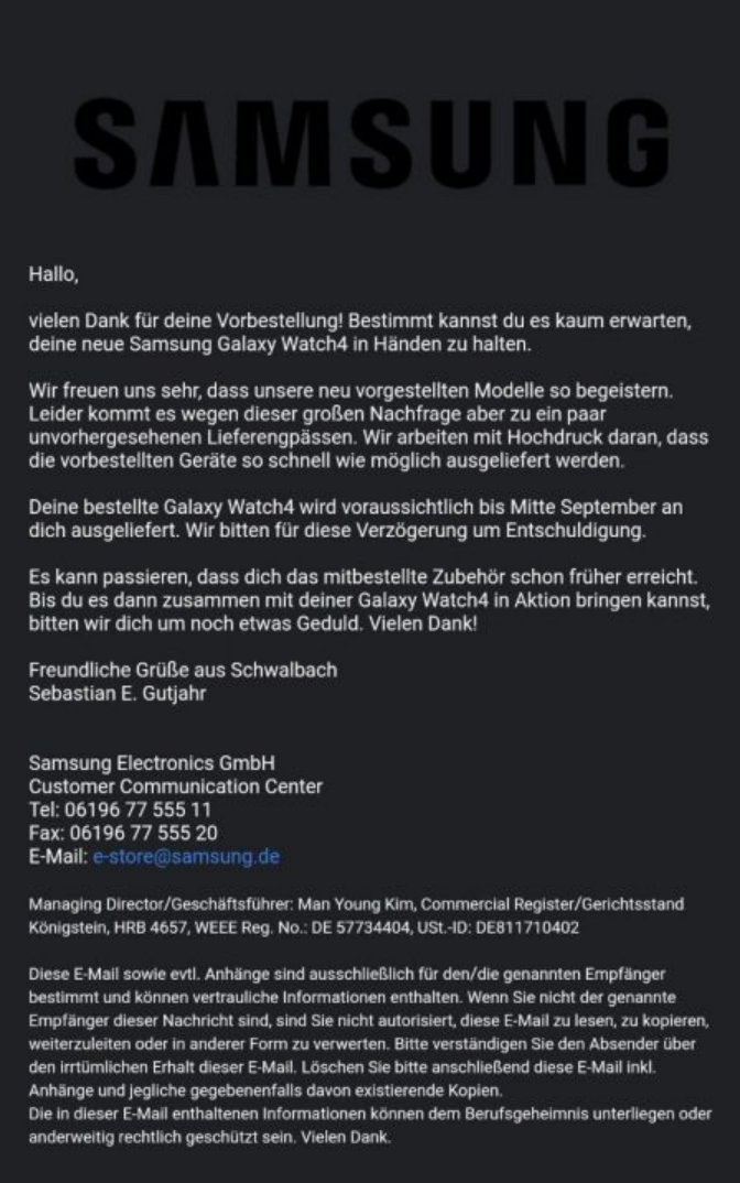 据外媒AllAboutSamsung报道,三星正在向一部分预购三星Galaxy Z Fold3和三星Galaxy Watch4的用户发送电子邮件,告知订单可能会推迟到9月中旬。