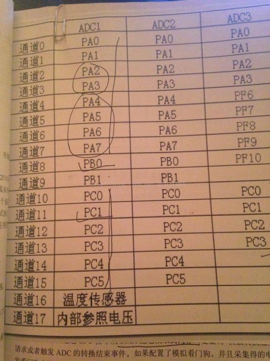 ---第一步是---了解STM32的ADC对应的GPIO口----如下图---不用记住,可以查询,我是将它剪下来粘贴到书本的相应章节----!
