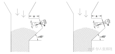 ⑦壁龛式安装:当物料(密度大、颗粒大)垂直落下并冲击料位开关探头时,为了确保测量仪表寿命以及测量效果,需将仪表安装于壁龛处,以保护探头不至于被物料压弯,如下图所示。