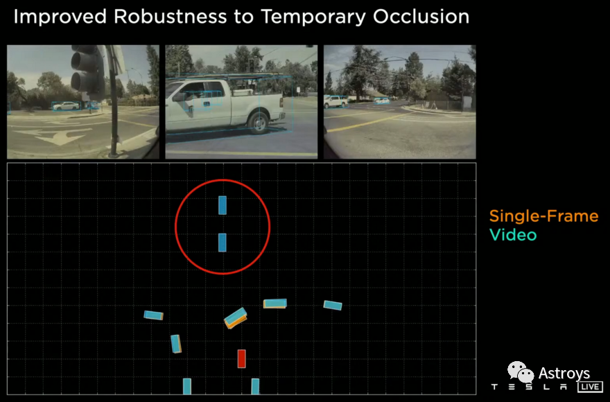 现在,终于把数据浓缩成了一个三维表示,可以开始真正的工作了。这是他们用来标注用于训练导航网络数据的空间,因为这个空间没有8个摄像机那么复杂,更容易进行标注。现在有了一个有效的方法来表示所有的8个摄像头,但仍然有一个问题:单摄像头的输入是不智能的。如果对面的一辆车被另一辆车遮挡,就需要Autopilot知道它还在那里,那辆车并没有因为另一辆车在它前面就消失了。为了解决这个问题,就必须使用时间信息,或者,换句话说,使用多个帧。特斯拉选择使用“Feature Queue”和“Video Module”。