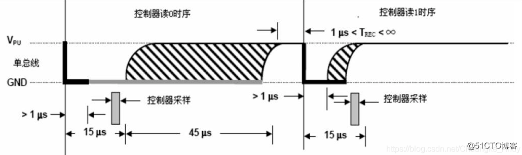 单总线器件仅在主机发出读时序时,才向主机传输数据,所以在主机发出读数据命令后,必须马上产生读时序,以便从机能够传输数据。所有读时序至少需要60us,且在2次独立的读时序之间至少需要1us的恢复时间。每个读时序都由主机发起,至少拉低总线1us,主机在读时序器件必须释放总线,并且在时序起始后的15us之内采样总线状态。典型的读时序过程为,主机输出低电平延时2us,然后主机转入输入模式延时12us,然后读取单总线当前的电平,然后延时50us