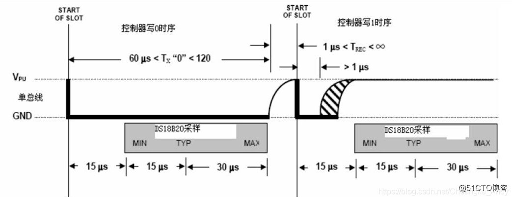 写时序包括写0和写1时序。所有写时序至少需要60us,并且在2次独立的写时序之间至少需要1us的恢复时间,两种写时序均起始于主机拉低总线。写1时序,主机输出低电平,延时2us,然后释放总线,延时60us;写0时序,主机输出低电平,延时60us,然后释放总线,延时2us。写时序图如下