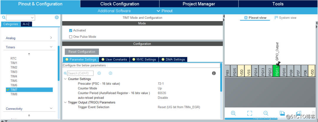 ➡️ 激活TIM7,预分频因子设为72-1,向上计数,自动重载值为65535;因此计数器CNT_CLK = 1MHz,计数器周期为1us