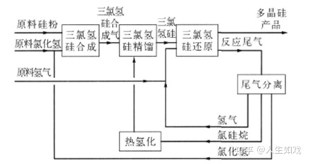 多晶硅是光伏产业太阳能电池中主要的原材料,其形成主要经过硅粉与无水氯化氢(HCl)在流化床反应器中反应生成三氯氢硅(SiHCl3),SiHCl3进一步提纯后在氢气中还原沉积成多晶硅。详细的工艺流程图如下图所示: