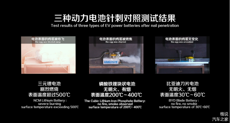 那就不得不再说一下比亚迪的电池针刺破坏性试验,这项电动车动力电池测试绝对称得上是此领域的天花板,完全模拟了电池的内部短路,是否能控制住电池的热失控就成为了动力电池是否会爆燃的关键,现场可以看到,刀片电池被刺穿后,不但没有明火,没有烟,甚至被刺穿部位的表面温度都能神奇的控制在30到60度,能通过针刺试验的动力电池,才是真正的安全,此试验的重点是,必须刺穿,刺穿,就问一下,还有谁。