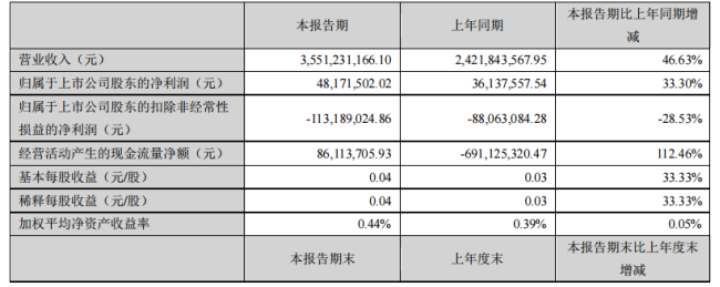 报告期内,国轩高科实现营业收入355,123.12万元,同比上升46.63%;实现营业利润5,802.02万元,同比上升37.75%;实现利润总额6,565.49万元,同比上升69.51%;实现净利润5,501,77万元,同比上升61.20%,其中,实现归属于母公司所有者的净利润4,817,15万元,同比上升33.30%。