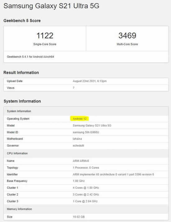 2021年08月29日 | 三星Galaxy S21 Ultra了被曝运行Android 12系统跑分