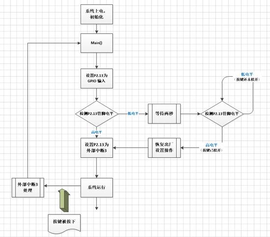 把按键接到LPC23xx的外部中断管脚(我这里使用EINT3即P2.13管脚),按下按键则触发中断,中断处理中发出重启系统操作。系统重启时候把P2.13设为GPIO输入,判断P2.13管脚输入电平。如果持续2秒为低电平(按键长按)则发起恢复出厂设置。设置完然后把P2.13改为外部中断3。整体流程如下图: