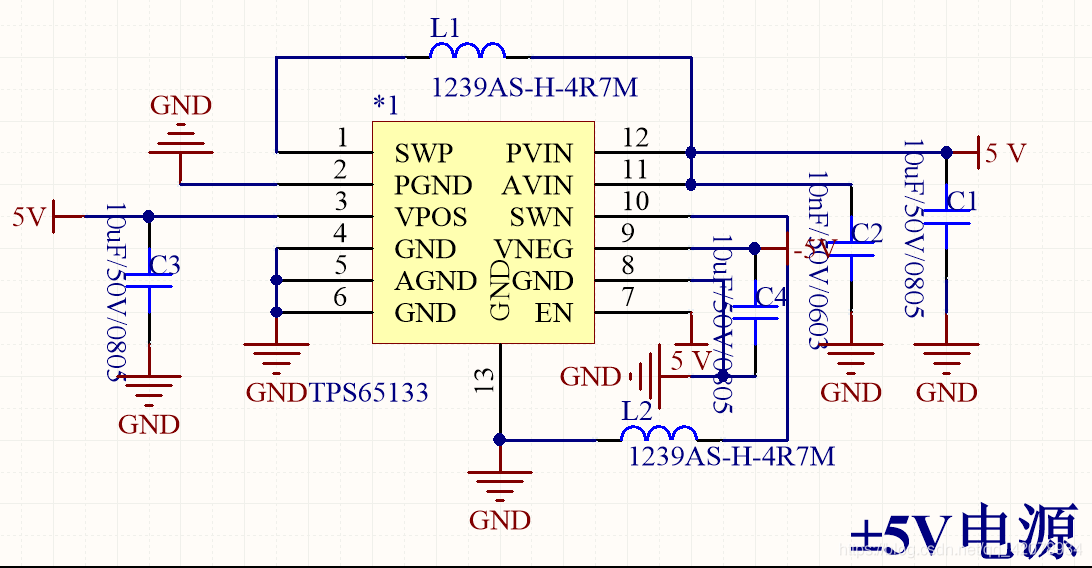 正负5V电源芯片TPS65133同样为TI公司的电源管理芯片,详细介绍可参考此博客link.