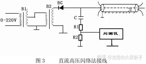 直流高压闪络法适用于闪络性故障,即故障点没有形成电阻信道(或电阻值极高),但电压升高到一定值时(通常是几万伏)就会产生闪络现象。 直流高压闪络法的接线图如图 3 所示。