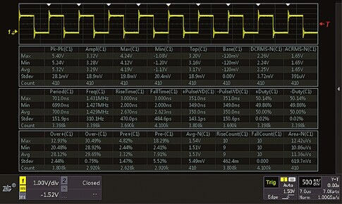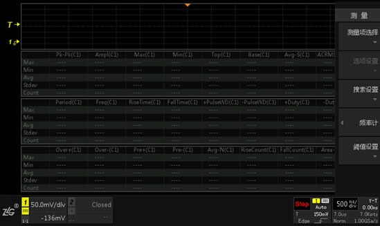 在ZDS2022示波器强大的测量统计功能中,标配51种参数测量,实时显示24种测量结果。