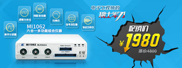 MI1062六合一多功能组合仪器,集数字示波器、逻辑分析仪、协议分析仪、信号发生器、码型发生器和扫频仪六大功能于一身,小巧便携,信号测量精准入微,操作易用简捷。