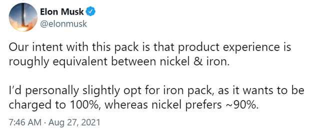 从目前的数据来看,铁锂版本的EPA 续航里程为 253 英里(407 公里),NCA 为 263 英里(423 公里)电池,目前在续航上存在10 英里的差异。而Elon Musk为了LFP 电池,还给出了自己的私人建议:在特斯拉的铁锂版本上可以把可用 SOC 窗口内充电至100% 充电状态 (SOC),不用担心电池寿命问题,推荐给消费者买买买。