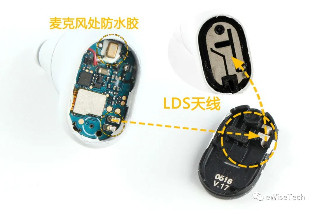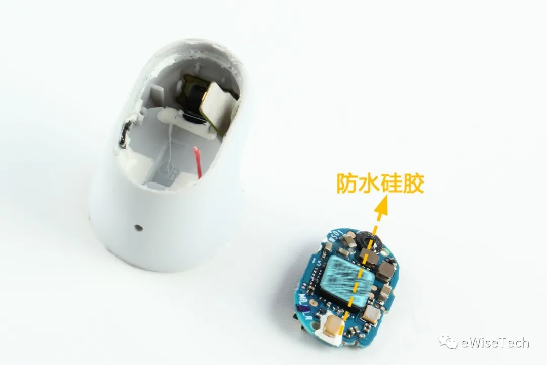 整个耳机的部件相对还是比较多的。耳机采用前壳、中框。后盖三段式结构设计。蓝牙天线为LDS天线设计。整个耳机共使用了两块PCB板、两块FPC板以及一块触控传感器板。由于防水性的问题,不仅在麦克风处,前壳和中框内部也使用了较多的白色硅胶。充电盒内部通过拆解,相对少见的在LED灯上使用了一个单独的塑料灯罩。并且充电盒加入了无线充电功能,无线充电芯片采用的伏达半导体的芯片。(编:Judy)