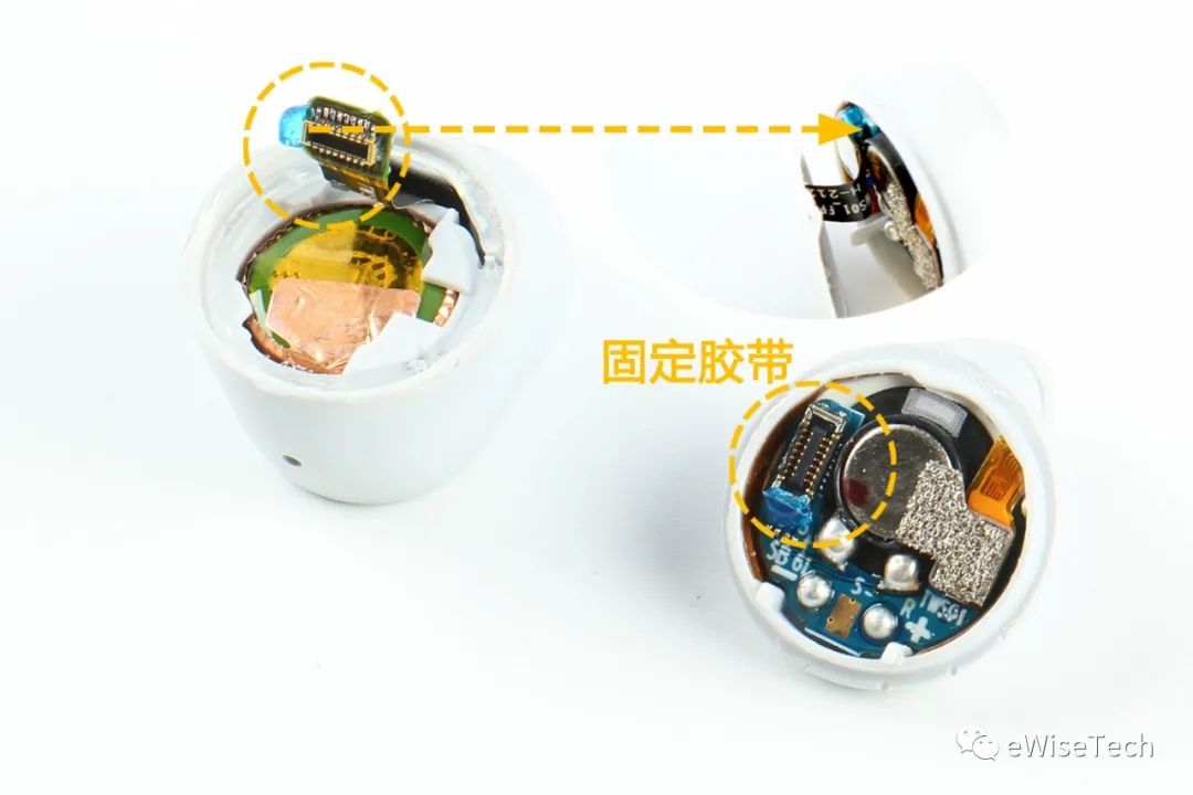 取下前壳内部的扬声器和转接板,扬声器焊接在转接板上。在板上的连接器位置贴有导电泡棉。充电触点也直接焊接在转接板上。前壳里面内部有一圈黄色电容式入耳检测软板,两侧有用于吸附充电盒的磁铁,下方泄压孔内部贴有防尘网。