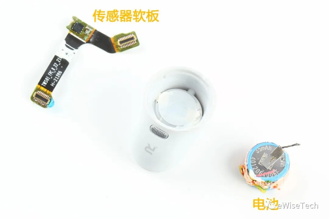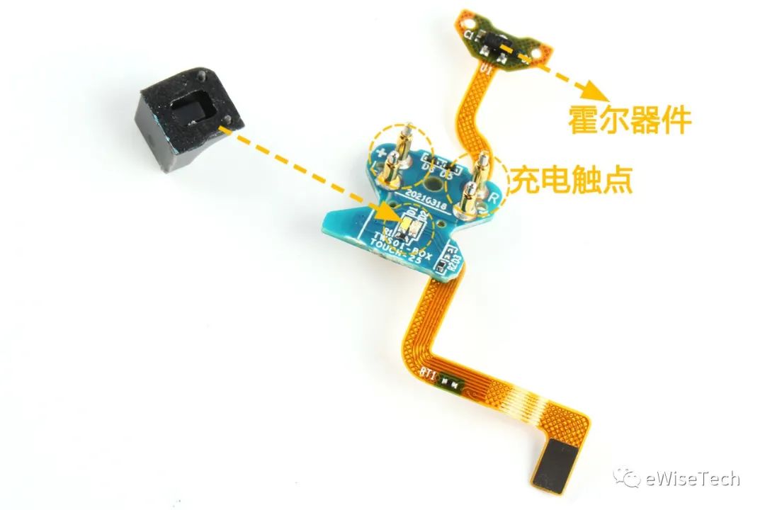 充电小板上面有个塑料灯罩,灯罩下方是两颗贴片LED,充电触点是4个弹簧顶针。上侧FPC软板上面有一个霍尔传感器件。用于感应充电盒开启及闭合。