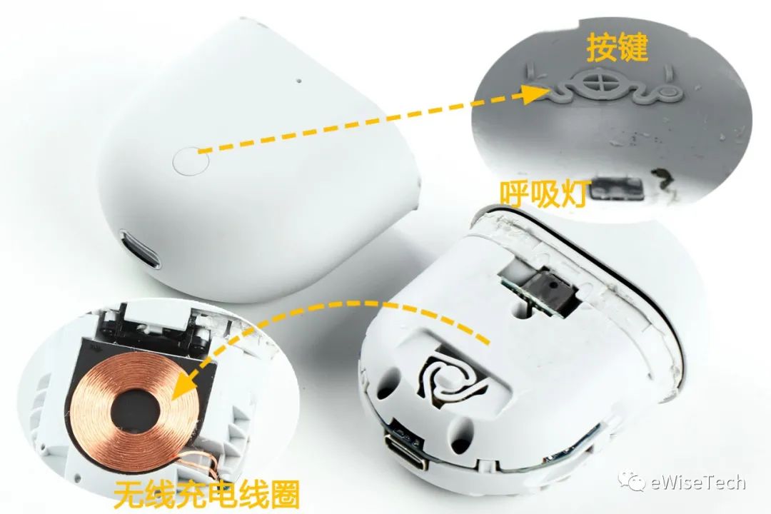 撬下充电盒的外壳后,在外壳内部可以看到底部的按键以及呼吸灯位置上的透明塑料片。充电盒背面是无线充电线圈。