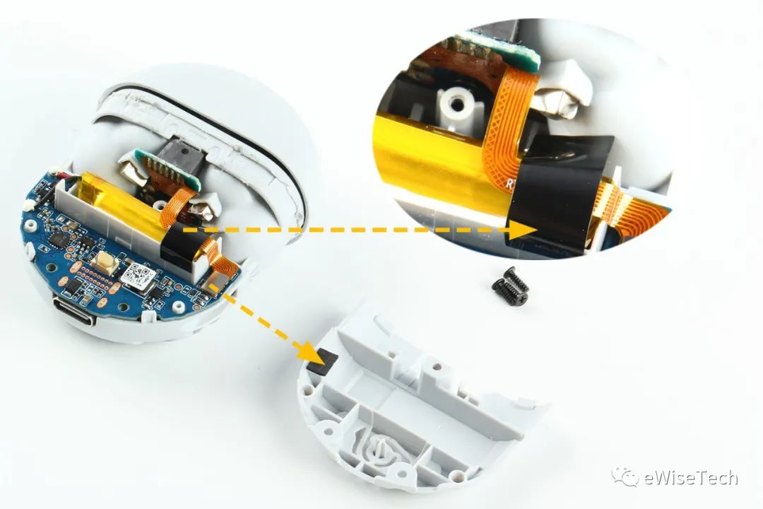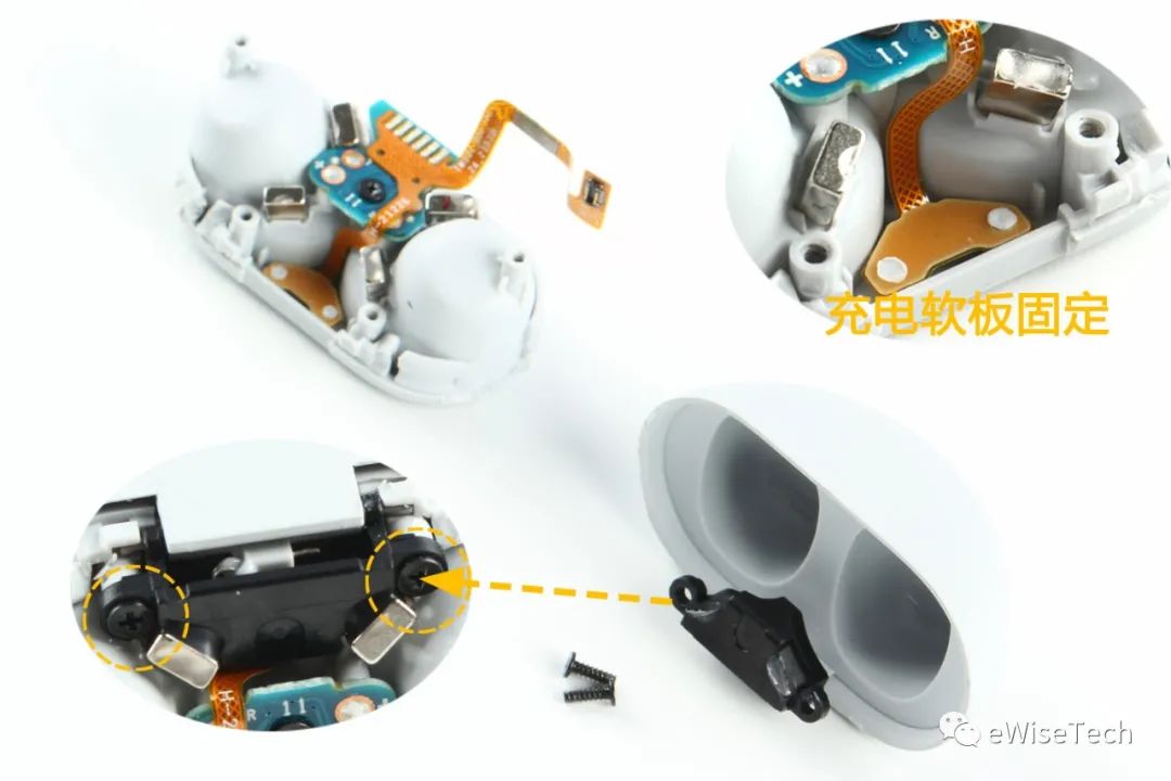 内支撑上面有两颗螺丝固定充电盒顶壳。拧下螺丝,取下充电盒顶壳。充电小板FPC部分有一块补强板固定在内支撑上面,通过热熔固定。
