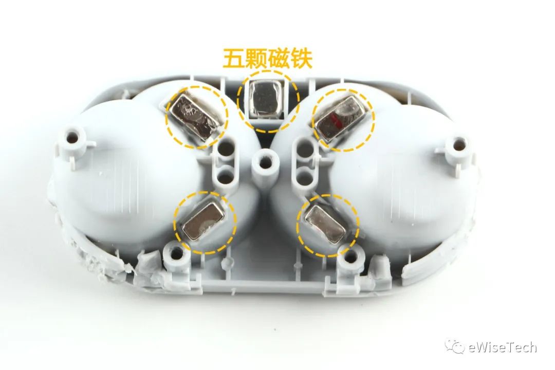 内支撑上面有五块磁铁。分别用于吸附耳机以及充电盒顶壳。