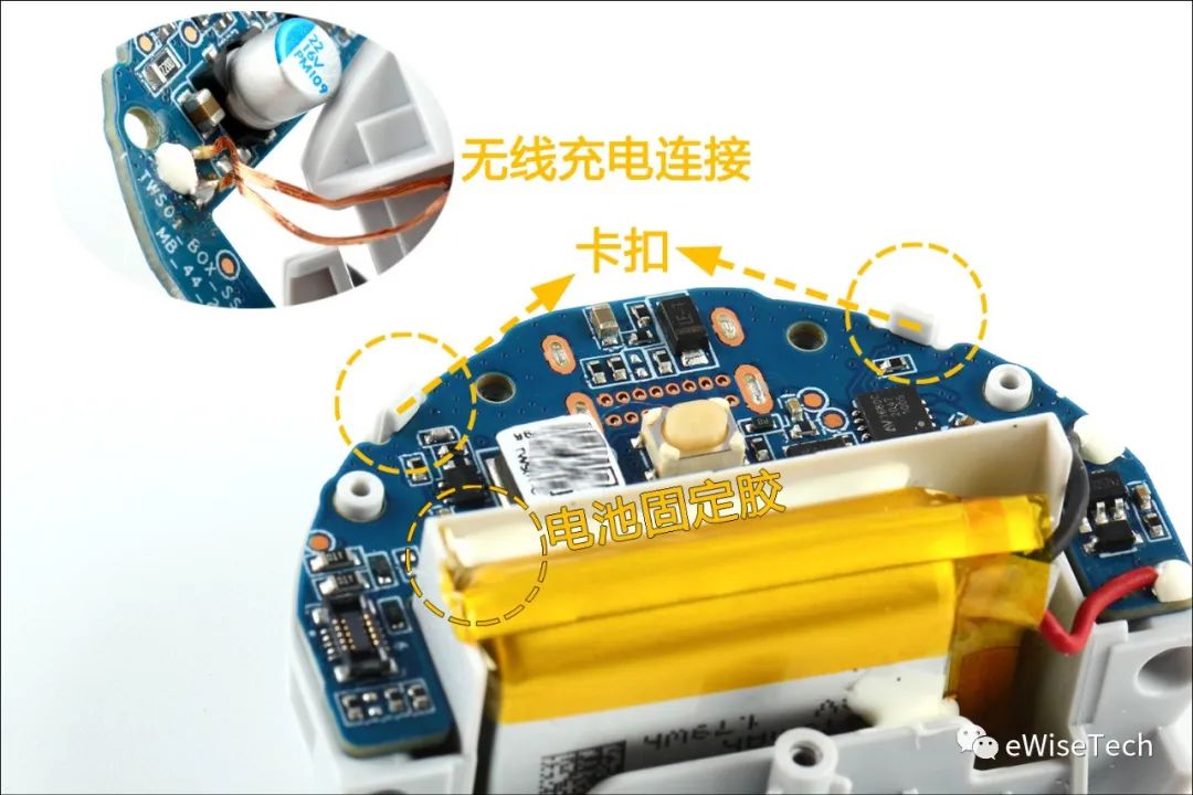 主板通过卡扣固定。但是电池和无线充电线圈都是使用导线直接焊接在主板上面,所以断开导线,取下主板。电池使用胶固定在外壳上。