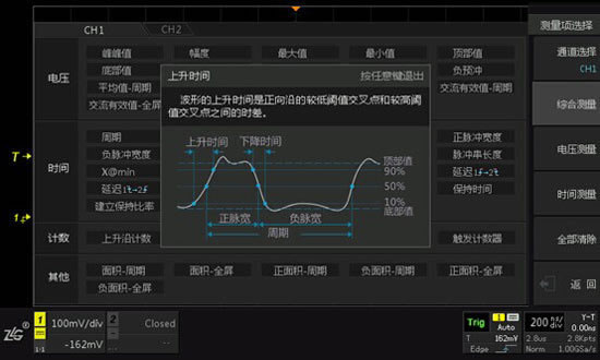 ZDS2022示波器具有51种参数测量统计功能,其中有些参数的概念您可能不是很熟悉,此时您只需旋转旋钮B选中某参数,然后长按B旋钮,屏幕上就会弹出一个帮助信息框,信息帮助框包含了这个参数的概念以及计算公式。