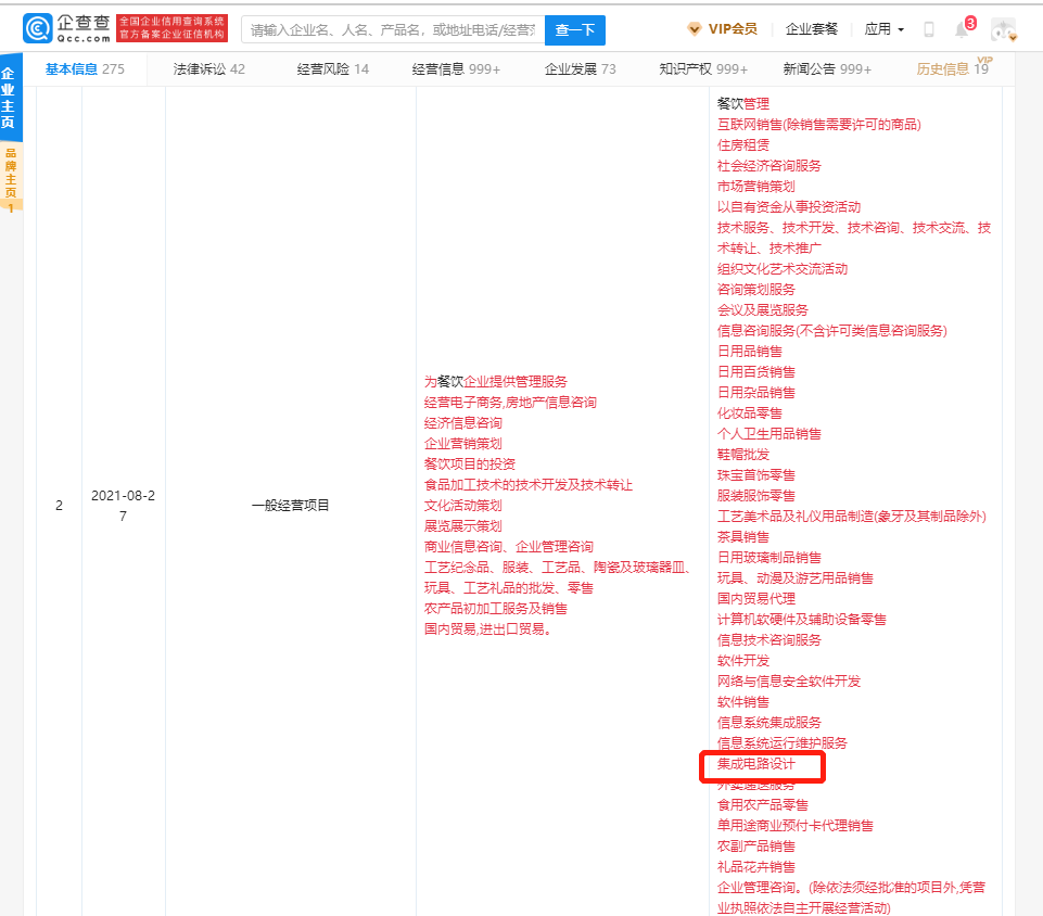 2021年08月31日 | 奈雪茶关联企业,经营范围新增“集成电路设计”等
