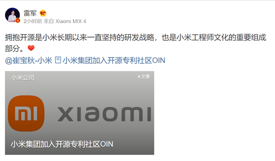 此外,雷军表示,拥抱开源是小米长期以来一直坚持的研发战略,也是小米工程师文化的重要组成部分。