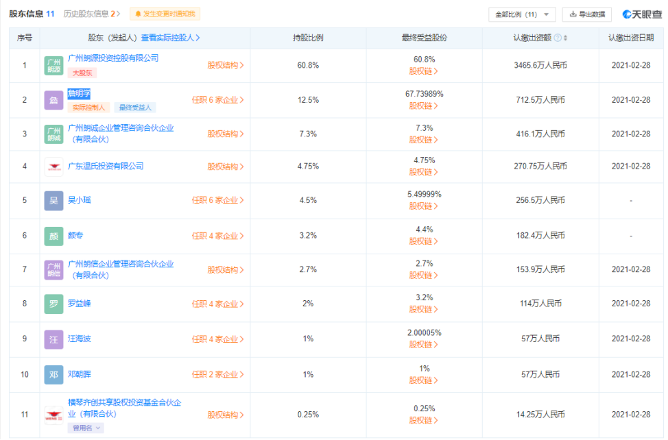 在股权结构方面,广州朗源投资控股有限公司持股60.8%,为郎国科技最大股东。而詹明学直接持股12.5%,并通过广州朗源投资控股有限公司、广州朗诚企业管理咨询合伙企业(有限合伙)共持有该公司67.73989%的股份,为郎国科技的实际控制人。