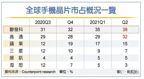 2021年09月02日 | 联发科拿下全球38%手机芯片市场,已连续四个季度超越高通