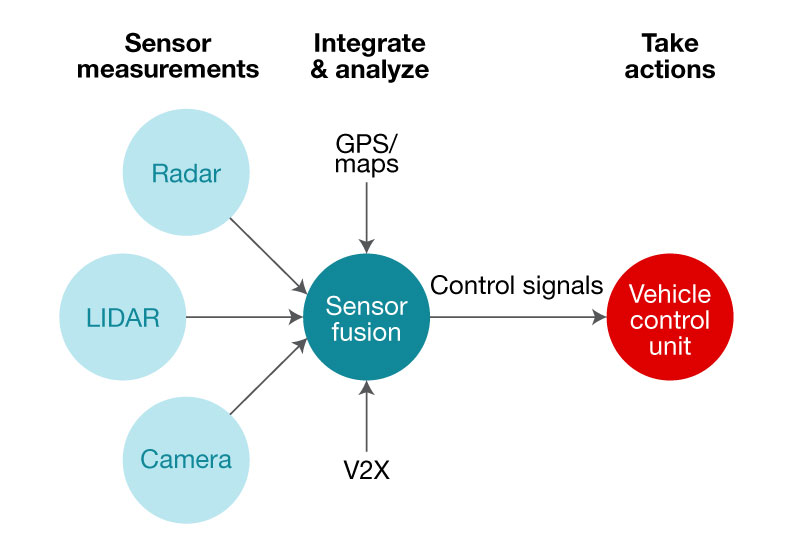 自动驾驶汽车使用多项传感器技术,包括摄像头、雷达和激光雷达。根据不同的环境条件和距离,这些传感器各有优缺点。传感器融合箱会分析这些传感器信号以及来自GPS和车联网系统的数据,用于创建精确的三维环境测绘图并发送适当的动作信号。图2是此类自主系统的方框图。