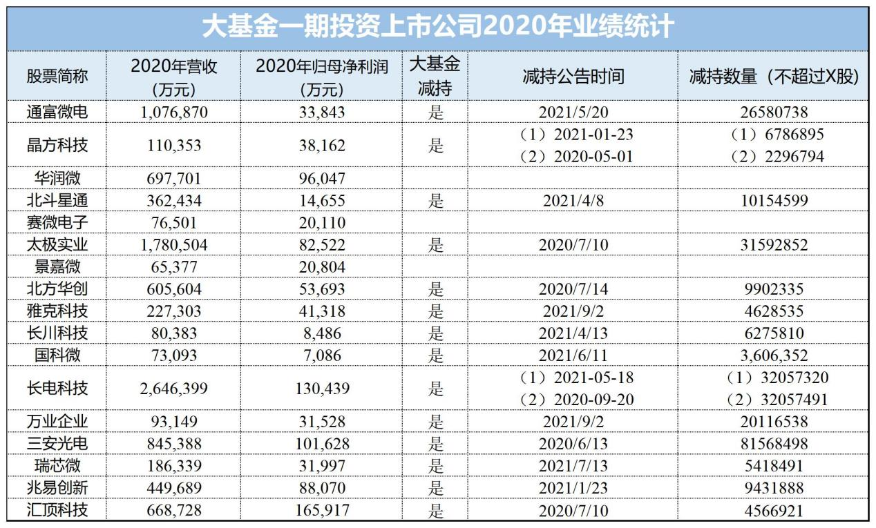 据统计,大基金一期持仓的17家半导体上市公司披露了2020年年报信息,所有公司均实现盈利业绩表现靓丽,截至目前大基金已对其中大部分上市公司进行减持,逐步退出投资。
