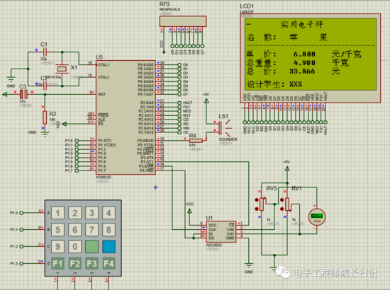 (3)当用按键输入对应商品的代码编号,在LCD上可以看到相应商品的名称,单价,总重,总价格等信息;