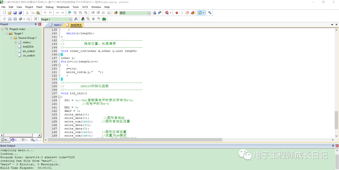 本设计利用KEIL5软件实现程序设计,具体如图。作为本科期间学习的第一门编程语言,C语言是我们最熟悉的编程语言之一。当然,由于其功能强大,C语言是当前世界上使用最广泛、最受欢迎的编程语言。在单片机设计中,C语言已经逐步完全取代汇编语言,因为相比于汇编语言,C语言编译与运行、调试十分方便,且可移植性高,可读性好,便于烧录与写入硬件系统,因此C语言被广泛应用在单片机设计中。keil软件由于其兼容单片机的设计,能够实现快速调试,并生成烧录文件,被广泛应用于C语言的编写和单片机的设计。