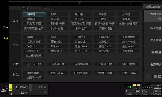 ZDS2022示波器是支持两通道测量参数同时显示的,只需切换通道 选择对应的测量参数即可。