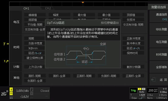 ZDS2022示波器的51种参数测量统计中包含了电压、时间、计数以及一些其他的常用的测量参数,实际上其中时间范畴内的延迟就是两通道波形间的时间差,旋转旋钮B选中上升沿到上升沿之间的延迟,长按旋钮B,ZDS2022智能小词典窗口就将该参数图文并茂地进行了说明,根据自己的实际需要选择相应的延迟类型,返回到主界面,两通道波形的时间差结果就自动测量出来了,完全避免了因手动测量造成的误差,不仅操作方便,而且功能实用!