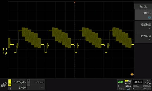向示波器输入模拟视频信号,按下【Trigger】键,将触发方式设为普通方式,触发类型设为视频类型,设置视频极性为负同步极性,共包含三种视频格式:NTSC( N制)、 PAL(帕制)和SECAM(塞康制),选择NTSC( N制),将触发模式设为任意行,我们调整触发电平,由于触发点在任意行触发,所以波形会不断移动。视频触发共包括任意行、指定行、任意场、偶数场和奇数场5种触发模式。我们将触发模式设为指定行触发,行设置范围可从1到525,将其设成400,调小时基,放大波形,可清晰看到稳定触发的波形,此时即为第400行触发。