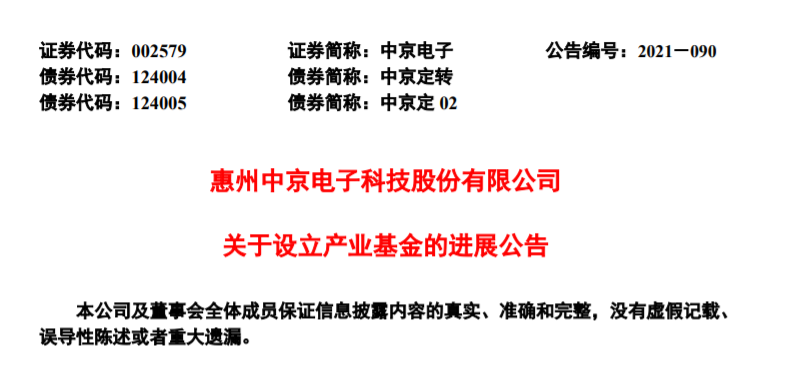 9月4日,中京电子发布了关于设立产业基金的进展公告。