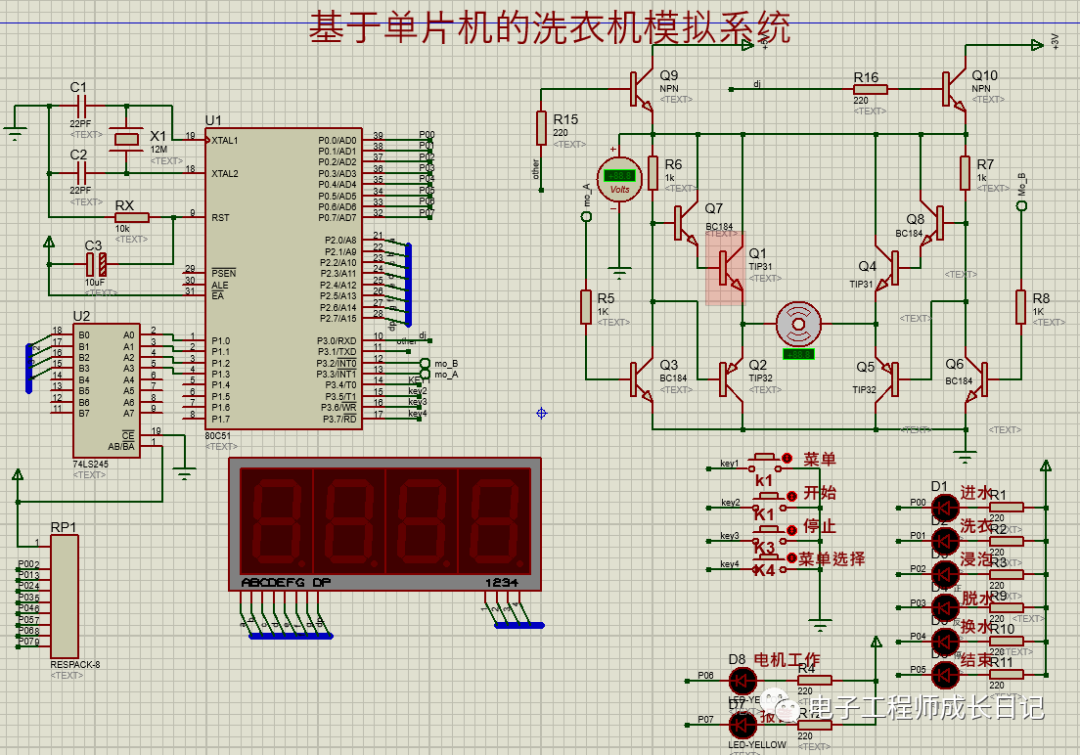 模拟全自动洗衣机工作过程,以电机替代洗衣机电机。