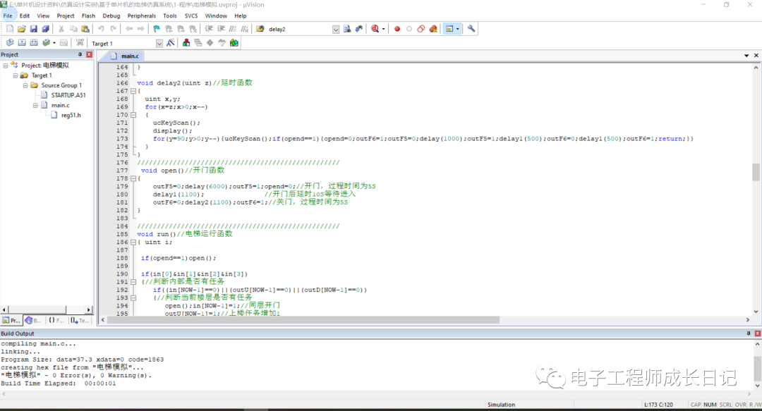 本设计利用KEIL5软件实现程序设计,具体如图。作为本科期间学习的第一门编程语言,C语言是我们最熟悉的编程语言之一。当然,由于其功能强大,C语言是当前世界上使用最广泛、最受欢迎的编程语言。在单片机设计中,C语言已经逐步完全取代汇编语言,因为相比于汇编语言,C语言编译与运行、调试十分方便,且可移植性高,可读性好,便于烧录与写入硬件系统,因此C语言被广泛应用在单片机设计中。keil软件由于其兼容单片机的设计,能够实现快速调试,并生成烧录文件,被广泛应用于C语言的编写和单片机的设计。