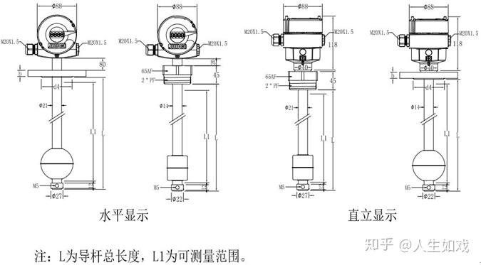 一般来讲,标准型浮球液位计共有四种结构尺寸,如上图所示。图中左一和左二为水平显示,左三和左四为直立显示。
