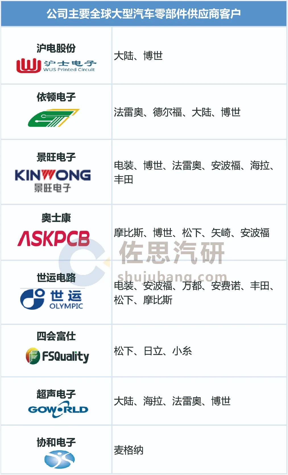 中国本土PCB企业全球大型汽车零部件供应商客户