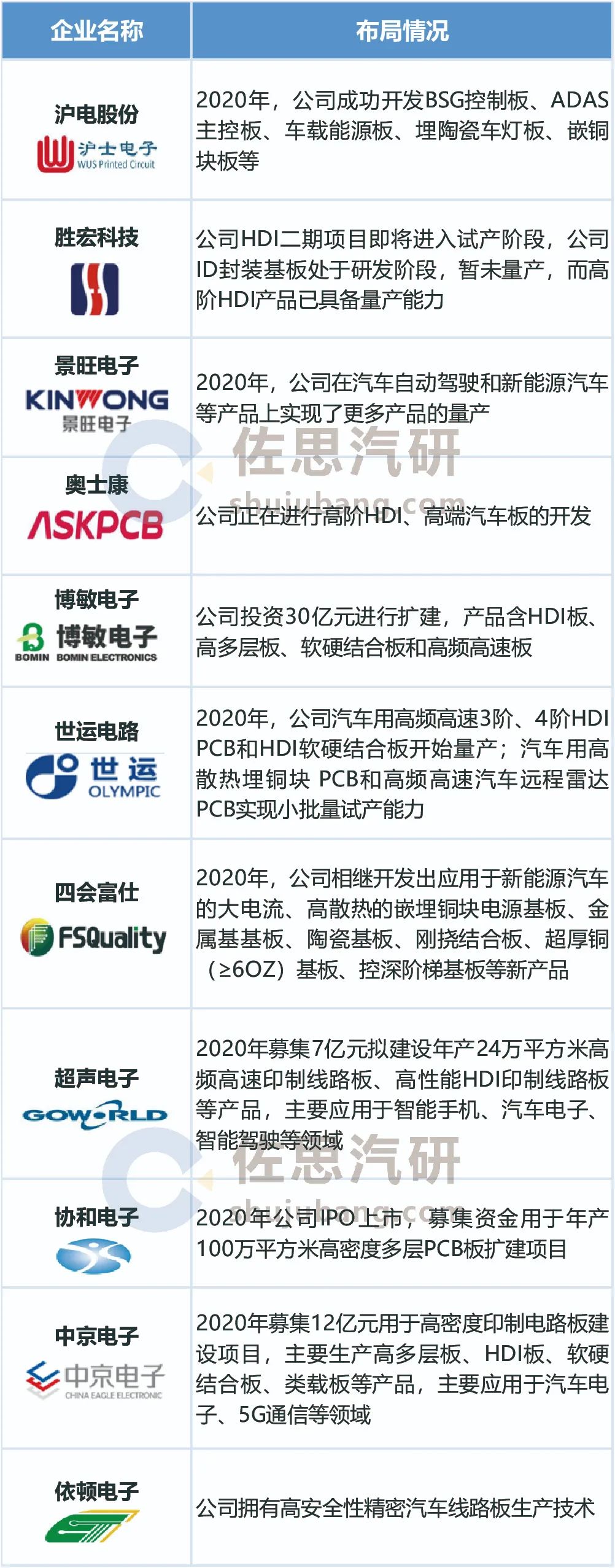 2020-2021年中国汽车PCB相关企业扩产计划