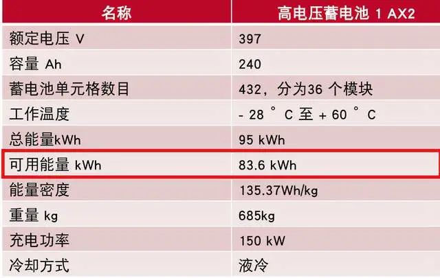 奥迪的几个电池系统都有这个问题,如下图所示95kWh的电池,可用能量83.6kWh,这个和我们国内的可用能量比例的差异还挺大。