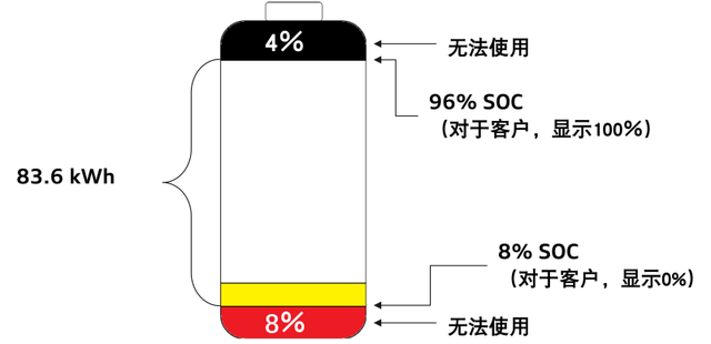 实际在这份材料的定义中,是这么分配83.6kWh的——在德国的工程师来看,4%的上限和8%的下限,相当于有12%的电量是没办法使用的(对应11.4kWh的能量)。下面这张图可以看出,在8%的SOC状态下对驾驶者直接显示0%,而96%则直接对应100%。