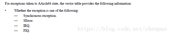 IRQ和FIQ是广大ARM嵌入式工程师的老朋友了,大家常说的中断实际上特指IRQ和FIQ,当然,实际上SError也是一种中断类型。IRQ和FIQ分别和cpu core的nIRQ和nFIQ这两根实际的信号线相关,interrupt controller收集各种来自外设的(或者来自其他CPU core的)中断请求,通过nIRQ和nFIQ的电平信号(active low)来通知cpu core某些外设的异步事件(或者来自其他CPU core的异步事件)。其中IRQ是普通中断,而FIQ是快速中断。由于中断来自cpu core的外部,可以在任何的时间点插入,和cpu core上执行的指令没有任何的关系,因此中断这种exception被归入asynchronous exception类别。