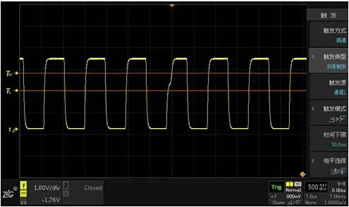 按下【Trigger】键,将触发方式设为普通,触发类型设为斜率触发,选择通道1作为触发源,触发模式共包括6种,其中分为正斜率与负斜率两类,我们选触发模式为输入信号正斜率时间大于指定时间时触发,时间下限设为50.0ns, 一方面可以通过旋转触发旋钮设置合适的触发电平,另外还可以在电平选择中来选择需要调节的触发电平。此时,在示波器屏幕上我们可以看到触发点已准确定位到符合条件的斜率波形上了。