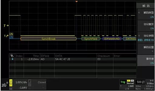 对LIN协议进行解码!按下【Decode】键,将解码类型设为LIN,开启协议触发,为了保证对完整帧进行有效解码,按下【Horiz】键,将储存深度设为112Mpts,将时基调大,可在解码环境下对协议触发位置清晰地观察,打开事件表,查看解码事件,ZDS2022示波器将LIN协议的触发与解码巧妙地联系了起来,用起来真得很方便!