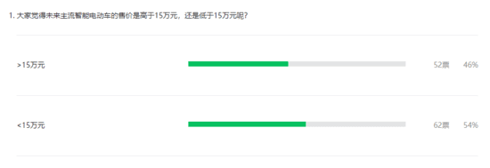 先来揭晓我们有关于“未来主流智能电动车的售价是高于15万元,还是低于15万元”的投票结果: