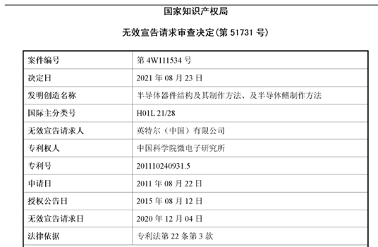 2020年12月,英特尔(中国)有限公司(以下简称:英特尔)向国家知识产权局提交了无效宣告请求,涉及专利为中国科学院微电子研究所(以下简称:中科院微电子所)的“半导体器件结构及其制作方法、及半导体鳍制作方法”专利(专利号为201110240931.5),请求宣告该专利权利要求1-7无效。