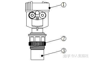 如图1所示,Uson-11超声波液位计的结构主要由①铝合金壳体,②锁紧螺母,③换能器等部件组成。